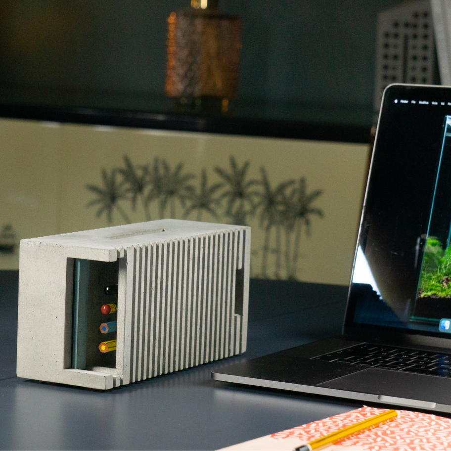 Depot is a handcrafted concrete pen and pencil holder designed with brutalist precision and a raw sculptural presence.